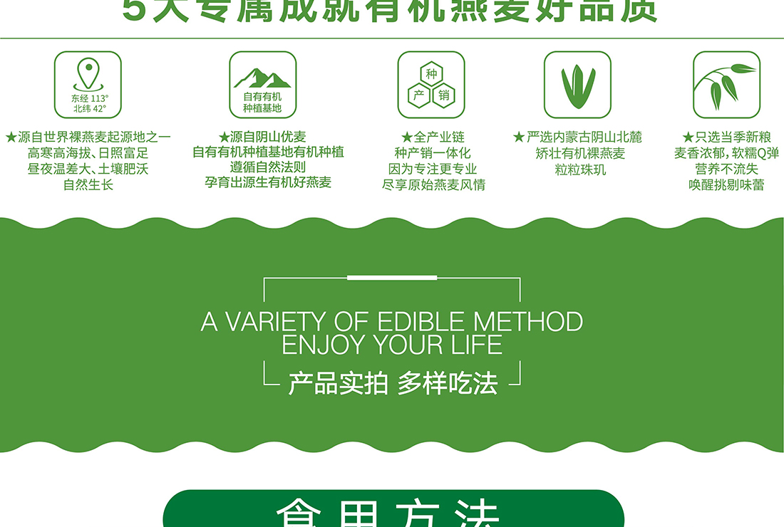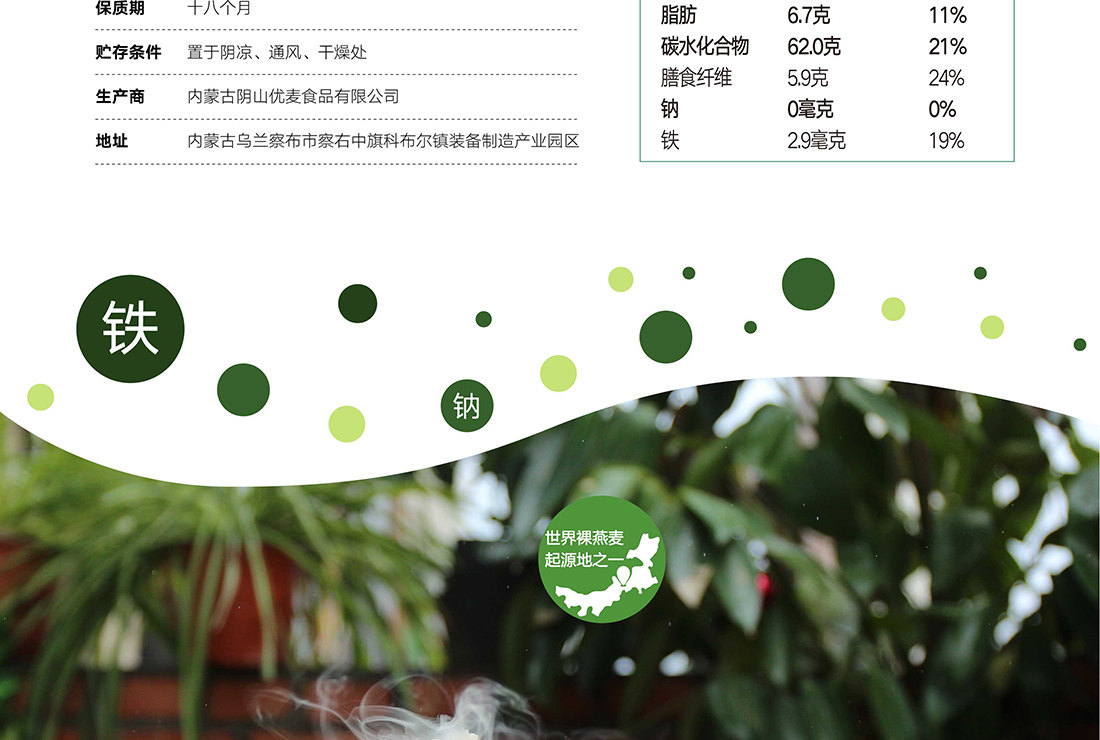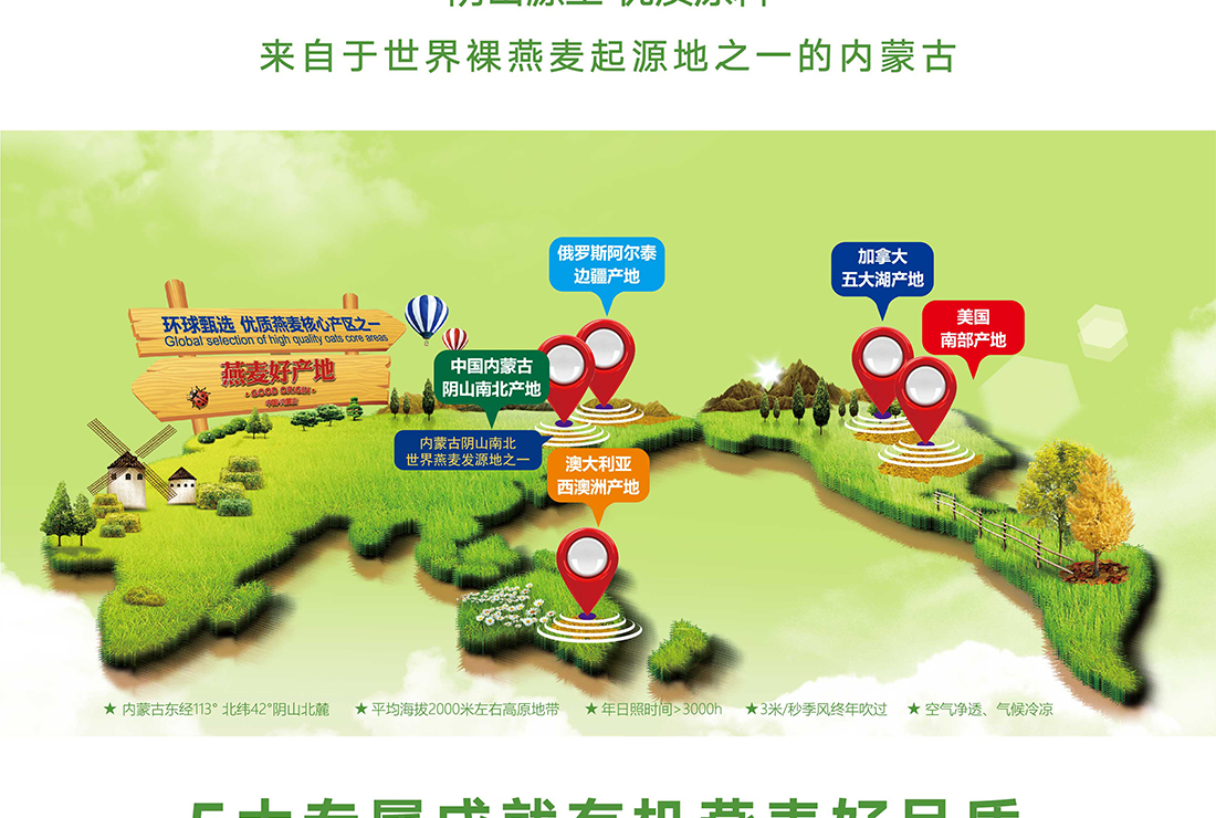 內蒙古,世界裸燕麥起源地之一;陰山源生燕麥在初出生滿足生長規律一切所需,高寒、高海拔、日照充足;遵循自然法則,靠天滋養,自然生長;