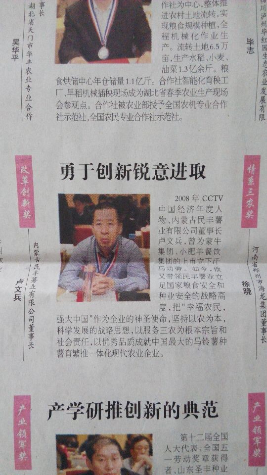 日前,全國“北大荒”杯2013年度“中國農村新聞人物”評選活動揭曉,內蒙古民豐薯業有限公司董事長盧文兵光榮當選,獲“改革創新獎”。