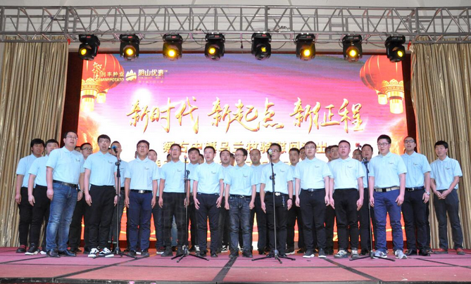 大會以播放短片的形式回顧了公司一年來的各項業務發展情況和取得的成績。副總經理邰志東代表公司首先向全體人員致辭,而后在察右中旗烏蘭牧騎《時代贊歌》、《守望相助》的歌舞里拉開序幕。頒獎環節,由22名優秀行政管理人員、生產管理人員、生產服務人員、銷售人員和14個最佳效益獎、最佳質量獎、最佳合作伙伴獎、優秀團隊獎、董事長特別獎的獲獎代表上臺接受了公司各級領導的頒獎和祝賀。同時,原種生產管理中心、脫毒組培中心、原種生產管理中心、物流倉儲中心用《民豐之歌》和《民豐我們的家》兩首大合唱表達了對公司的贊美和熱愛之情。最后,大會在烏蘭牧騎《在你偉大的懷抱里》的舞蹈里走向高潮。表彰大會和文藝演出穿插進行,環環相扣,方式新穎,得到了全體員工的一致好評,也為即將開始的新春生產種植工作注入了活力,帶來了動力。